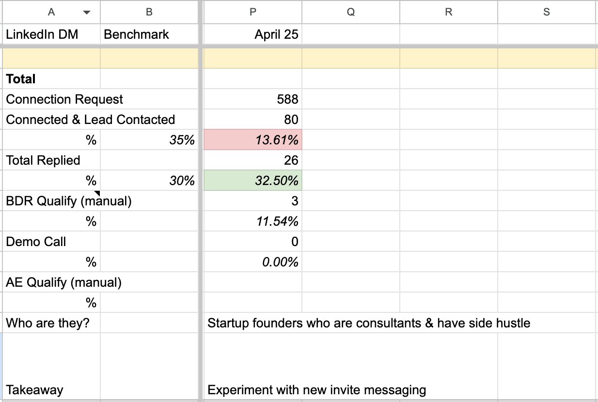 You know, when I started my LinkedIn outreach, I felt good and positive about it. With LinkedIn, I am building my presence, posting content, people see my profile, which is part of that founder-led sales process. So, I’ve been creating a list of prospects and also iterating on our messaging. I've been running this for the last two weeks or so, and the response rate has been decent and could be improved. Sometimes, rejection can be very discouraging for me, but I'm trying to gain a new perspective to say, "Hey, it's an opportunity to continue to experiment," which means rewriting some of those intro messages to make them less sales-pitchy and trying to be more personal to start a conversation.