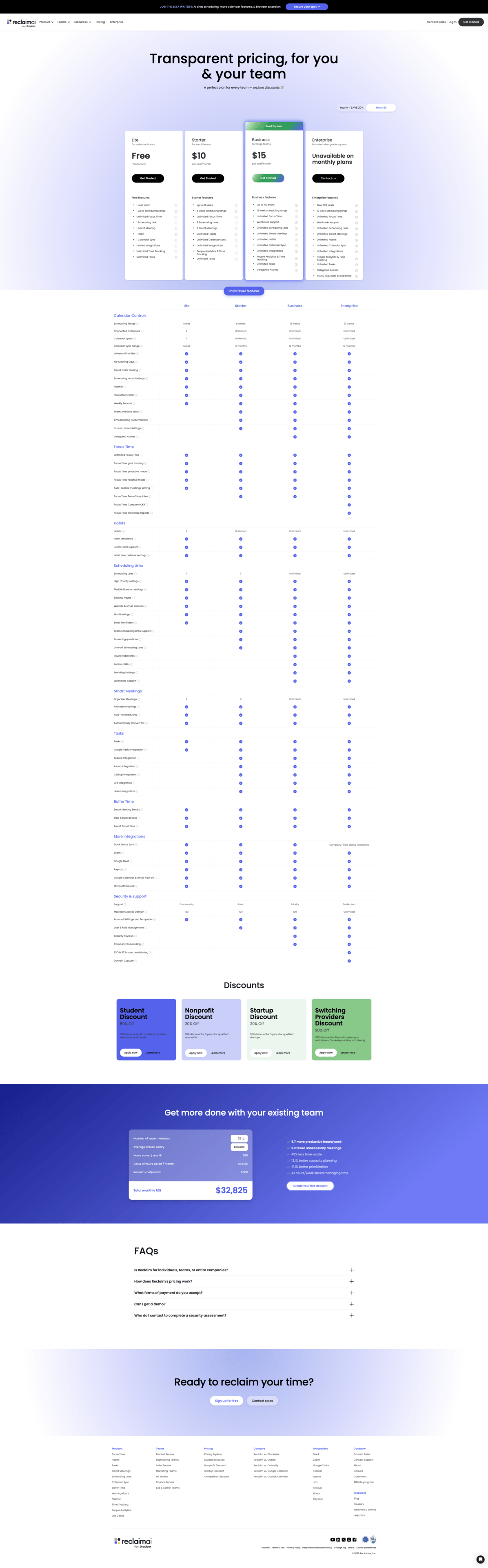 Free Forever tier: Core AI scheduling, habit tracking, and calendar sync across one account