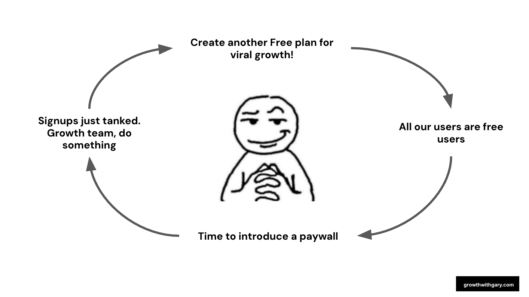 This meme is a satirical illustration of a common SaaS product growth "doom loop." In the center is a smirking internet meme character with hands clasped mischievously. Surrounding the character is a circular flowchart with four key stages: “Create another Free plan for viral growth!”, “All our users are free users,” “Time to introduce a paywall,” and “Signups just tanked. Growth team, do something.” Arrows connect each phrase in a clockwise cycle, highlighting how companies can get trapped repeatedly oscillating between viral, free and paid models without sustainable SaaS growth.