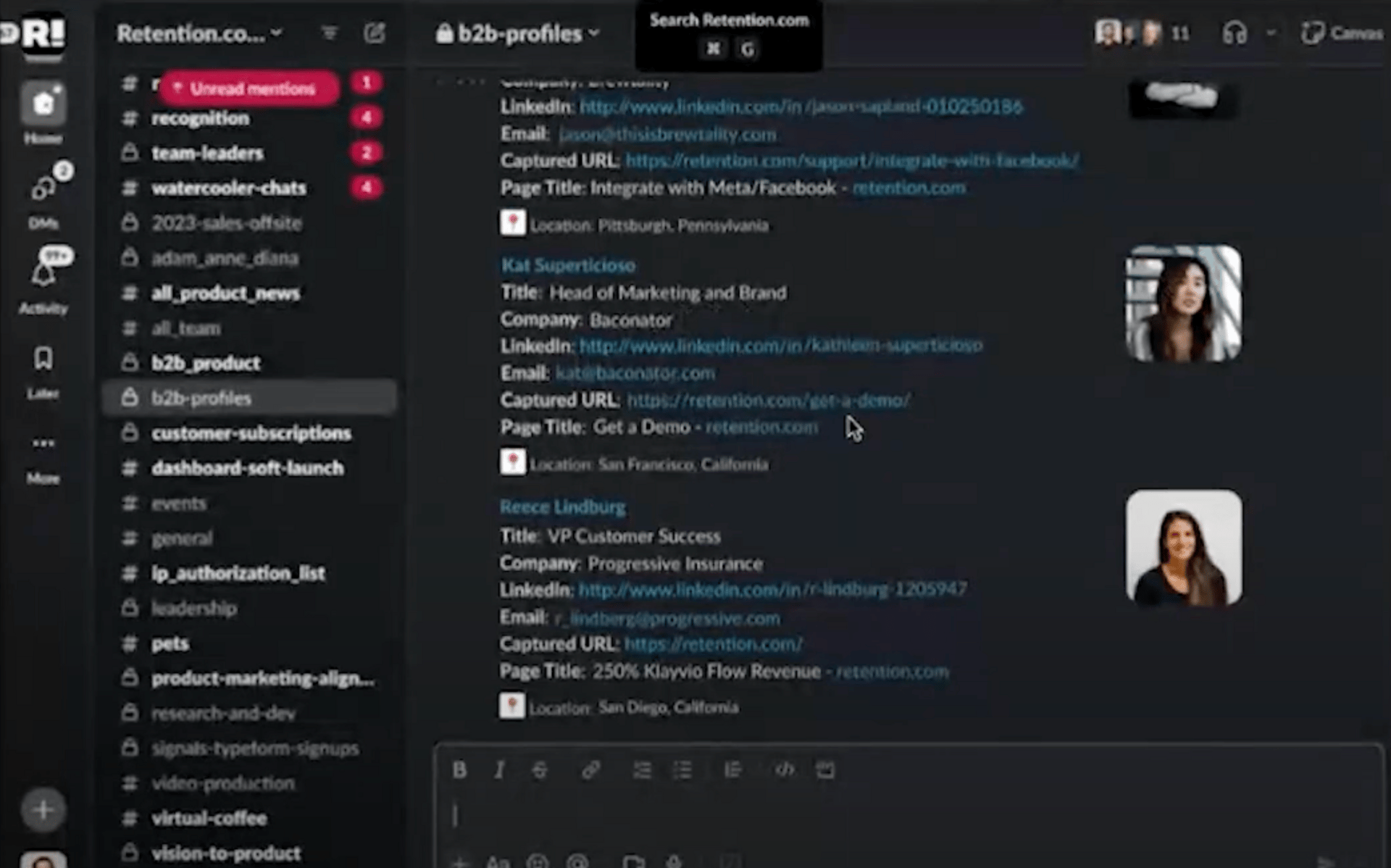 Slack Notifications: Every visitor-identified alert in shared channels exposes value to sales, exec, and marketing teams